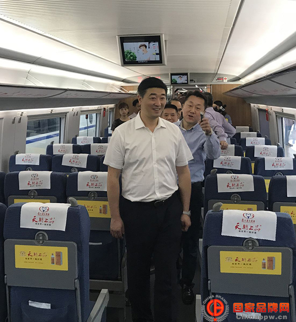 天朝上品酒业代表在上海铁路局领导的陪同下,登上首列“天朝上品号”高铁专列,天朝上品品牌元素融入列车的每一个环节,从外车身广告、车内海报、车厢门贴,到LED信息滚屏、语音播报系统,成为天朝上品品牌文化全方位、立体化的移动长廊,实现了品牌文化与产品信息的精准联动传播。
