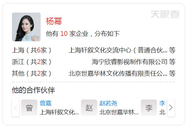 中新经纬客户端通过查询天眼查发现,除了嘉行传媒,仅杨幂旗下就有10家公司,包括上海杨幂文化交流中心、上海杨幂文化传媒中心等等,均为影视文化类公司,其中6家公司的注册地为上海,两家公司在浙江,剩下两家分别在北京和西藏,而2家上海公司状态为“注销”。除此之外,杨幂还担任着6家公司的法人,8家公司的股东和8家公司的高管。