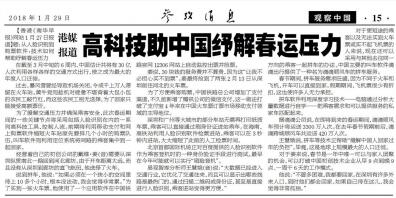 据新加坡《联合早报》网站2018年2月12日报道,“刷脸”进站、人像识别警务眼镜、虚拟实境(VR)全景导航、智能机器人引路,这些集中在春运亮相的高科技,让历来以大量人口流动而闻名的中国春运颇显科技范儿。