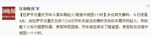 一列拉萨开往重庆列车起火 乘客被困1小时呼吸困难