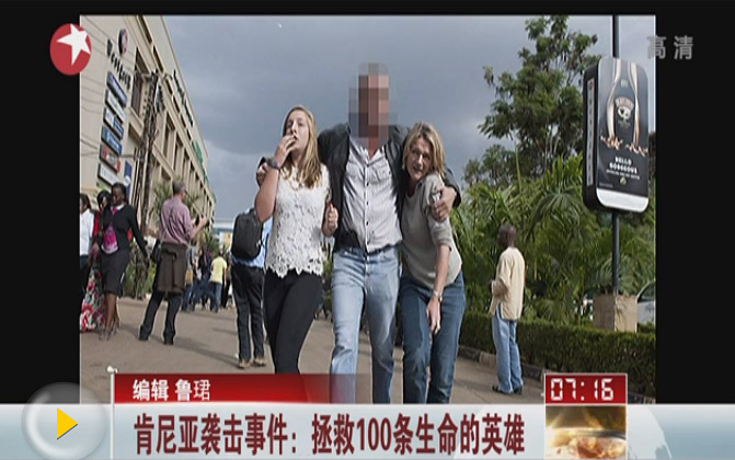 当地时间9月21日,肯尼亚首都内罗毕一家“西门”(Westgate)商场遭到一伙武装人员袭击,暴徒向人群开枪并投掷手榴弹,已造成69人死亡,170人受伤。据英国《每日邮报》9月23日报道,在英国陆军第22特别空勤团(Special Air Service)服役的一名士兵当时在该商场内与友人喝咖啡,发现有意外情况时,立即行动起来,腰间插有一把手枪的他前后在枪林弹雨中往返商场12次,共救出100人,被赞为英雄。