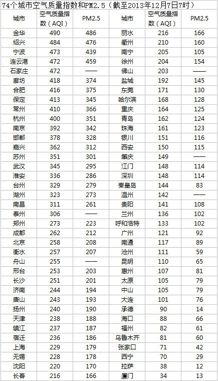 人民网北京12月7日电 (初梓瑞)截至今日早上7时,金华的AQI(空气质量指数)达到490,属于严重污染,成为74个公布PM2.5数据城市中空气质量最差的城市。北京的AQI(空气质量指数)达到258,属于重度污染。