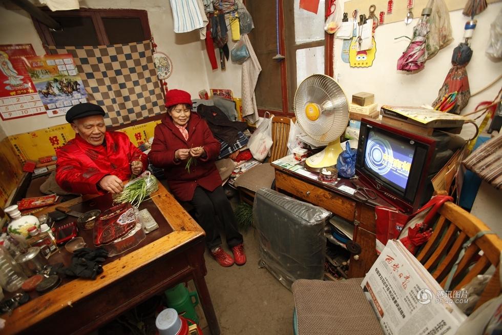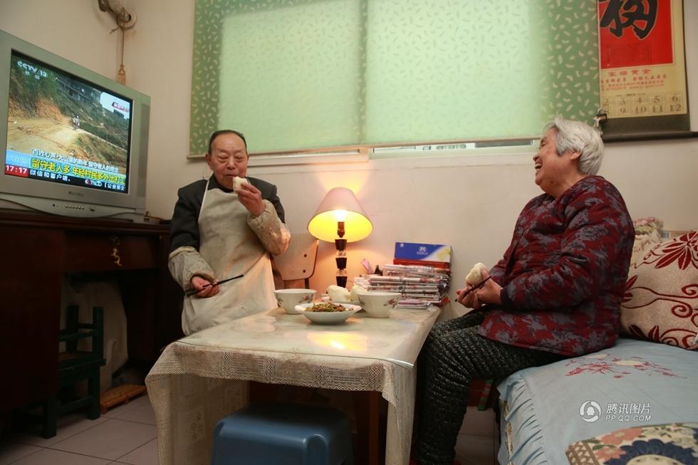 2014年2月9日,西安市和北社区,83岁的韩德福给78岁的老伴郭珍珠做晚饭,然后他们一边看电视一边吃饭,吃完后老伴负责洗碗。”我做饭没他做的好吃,我就负责洗碗“郭大妈笑着说:“今年过年是去女儿家过的,他们要上班,我们两口子就回来自己过,每天看电视、下棋,过得十分充实,儿女也经常打电话问候我们的身体,把我们自己身体照顾好不给他们添麻烦,我们就很幸福。”