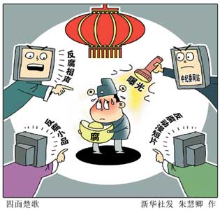 节日期间,反腐的高压态势持续保持。春节前夕的2月17日,中纪委网站公布了“江西省政协副主席许爱民严重违纪被开除党籍”。今年元旦春节期间,中央纪委监察部网站开通“四风”问题监督举报曝光专区,每周对违反中央八项规定精神案件进行通报,截至2月21日已连续5周通报620起案件,点名曝光855人。此外,反腐相声、反腐动漫短片等,借助春晚舞台和互联网媒介发挥了巨大的社会效应,营造了激浊扬清的社会氛围。