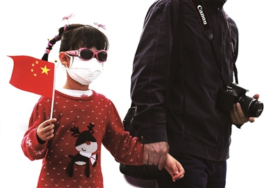 昨天雾霾继续笼罩京城,很多孩子都戴上了大人的口罩 摄影/记者 郝羿