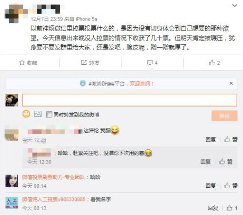受访者微博下的评论聚集了微信刷票团队。截图来自受访者微博
