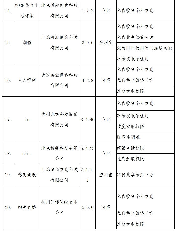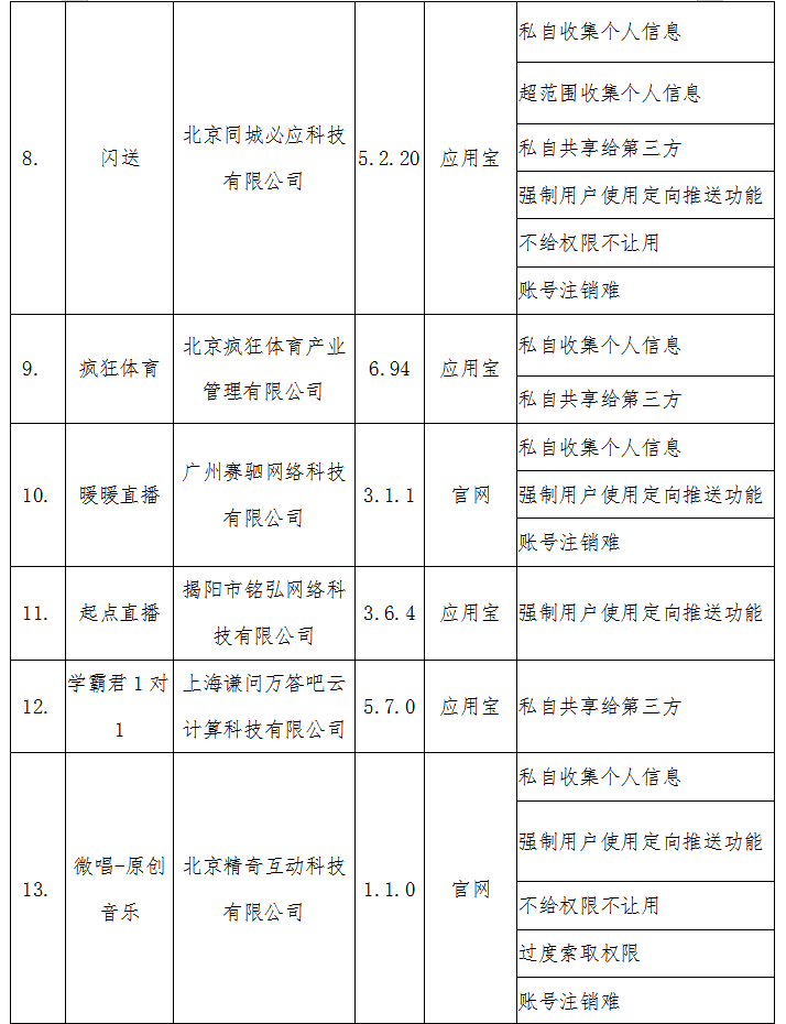 以QQ的8.2.0版本为例,所涉问题为强制用户使用定向推送功能、不给权限不让用、账号注销难等问题。闪送存在最多问题,其在应用宝上发布的5.2.20版本的闪送APP,存在私自收集个人信息、超范围收集个人信息、私自共享给第三方、强制用户使用定向推送功能、不给权限不让用、账号注销难等六大问题。