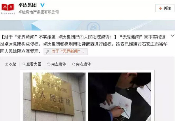 讽刺的是,在卓达集团的官方微博上,该公司却自称将采取“法律”手段维护权益。看来该公司对于“法律手段”的认识,与正常人似乎区别很大…