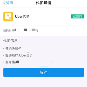 相关人士表示,绑定支付宝免密支付是可以顺利在支付宝内解除代扣协议的,建议所有不再使用老版本优步APP的用户都能将该协议解除,以免发生不必要的风险。具体步骤如下: