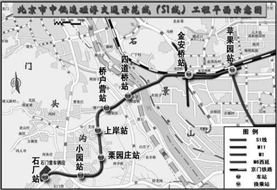 S1线线路全长10.2公里,共设8座车站,分别是:石厂站、小园站、栗园庄站、上岸站、桥户营站、四道桥站、金安桥站、苹果园站。本次开通石厂站至金安桥站区段,7座车站,长9公里。