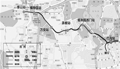 西郊线全长约9公里,共设6座车站,分别是:香山站、植物园站、万安站、茶棚站、颐和园西门站、巴沟站。