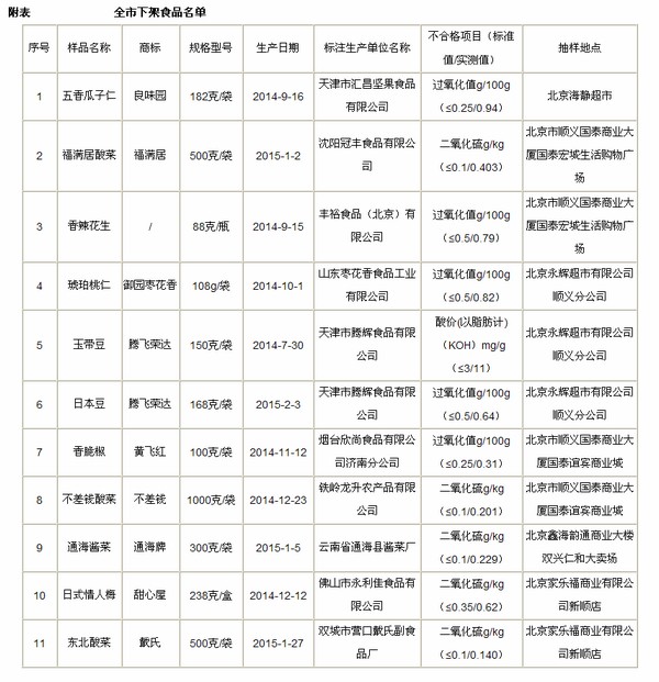 新华食品8月5日电(方玮晴)5日,北京市食品药品监督管理局发布信息,“良味园”牌五香瓜子仁等11种食品因过氧化值、二氧化硫超标等原因下架。不合格食品分别来自国泰、永辉、家乐福等大型商超。