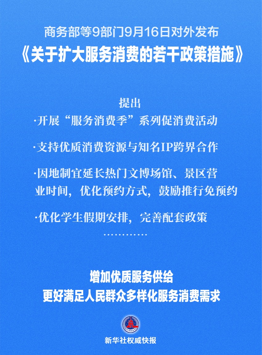 新华社北京9月16日电(记者王雨萧、魏弘毅)商务部等9部门16日对外发布《关于扩大服务消费的若干政策措施》,提出五方面19条举措进一步扩大服务消费。