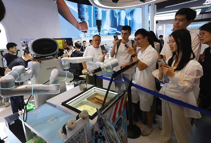 7月29日,上海2025世界人工智能大会上,一个服务机器人在向参观者演示制作冰激凌球。新华社记者 方喆 摄