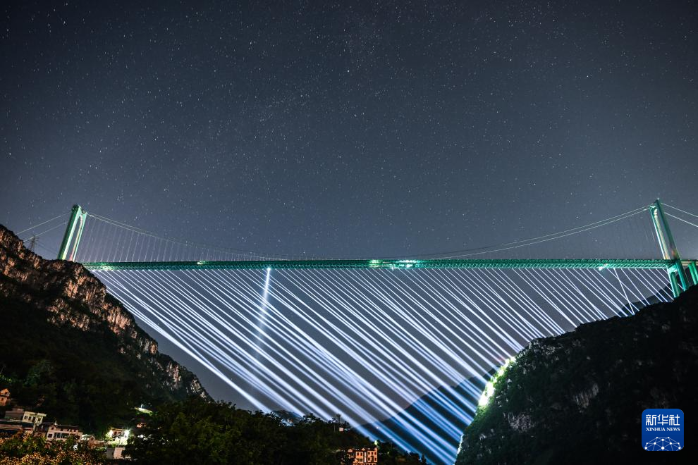 夜晚,新的世界第一高桥——贵州花江峡谷大桥呈现出不同光影美景,吸引游客前来观赏。