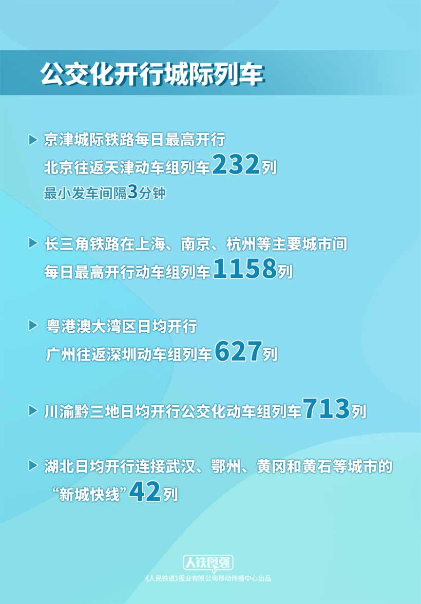 三是公交化开行城际列车。在通勤、短途游需求较旺盛的京津冀、长三角、粤港澳大湾区、成渝等地区安排公交化开行城际列车,构建半小时、1小时交通圈,催生同城化效应,京津城际铁路每日最高开行北京往返天津动车组列车232列,最小发车间隔3分钟,长三角铁路在上海、南京、杭州等主要城市间每日最高开行动车组列车1158列,粤港澳大湾区日均开行广州往返深圳动车组列车627列,川渝黔三地日均开行公交化动车组列车713列,湖北日均开行连接武汉、鄂州、黄冈和黄石等城市的“新城快线”42列。