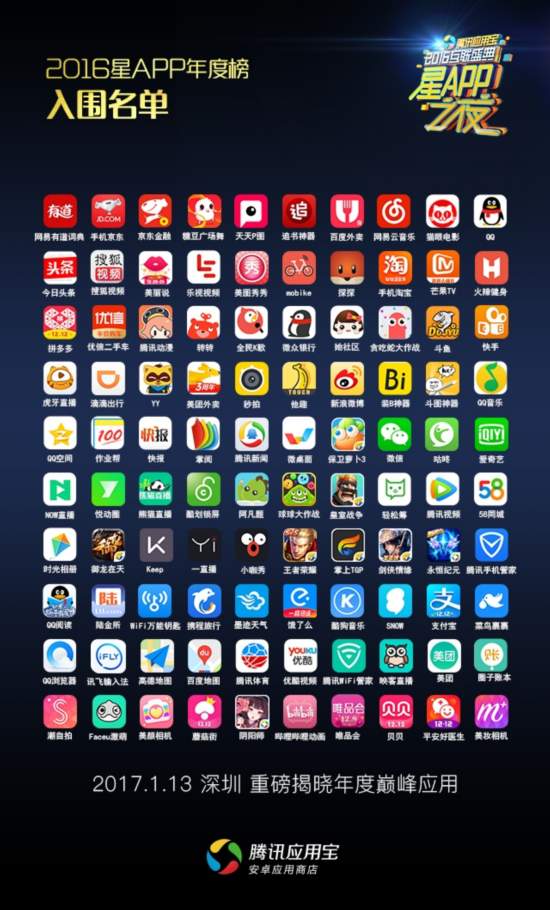 1月13日,“2016腾讯应用宝互联盛典——星APP之夜”在深圳揭开帷幕,并将在现场揭晓2016“星APP榜”,即从此前入围的百强名单中,推选出十大年度热门应用及十大年度新锐应用。