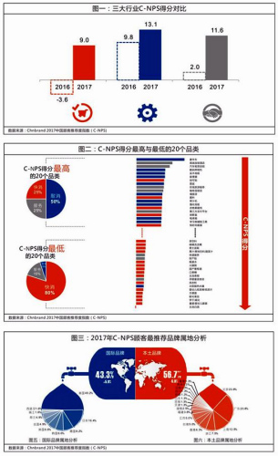 2017年中国整体NPS得分为10.3分,相较去年的-1.1分提升显著。三大行业中,耐用消费品得分仍为最高,达13.1分。快速消费品得分虽仍是最低,但相对去年增长最为明显。