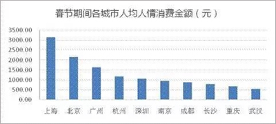 数据显示,2016年春节零售和餐饮企业实现销售额7540亿元,赚得盆满钵满。全国人均消费1308元,其中,北上广三地土豪最多,上海人以3157元拔得头筹。