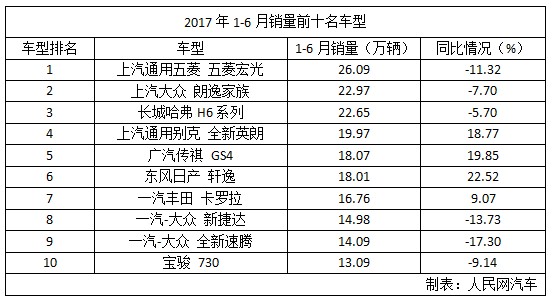 1-6月销量前十车型仍以“性价比”优势为主