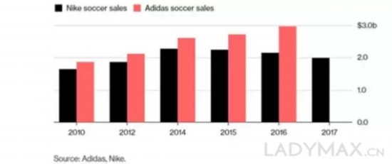 图为彭博社对Nike与adidas近五年来足球类产品销售额统计对比