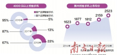 根据中国信通院发布的报告,去年国内手机市场向高端转移:智能手机均价为2523元,同比上涨16.8%,较2017年(2159元)提价了364元。报告指出,近年来受技术发展和市场需求导向的影响,手机的零部件不断更新换代(如芯片升级,屏幕由LCD升至LED,摄像头个数增加等),使得手机总体成本逐渐上升,这也是造成手机价格上涨的主要原因。