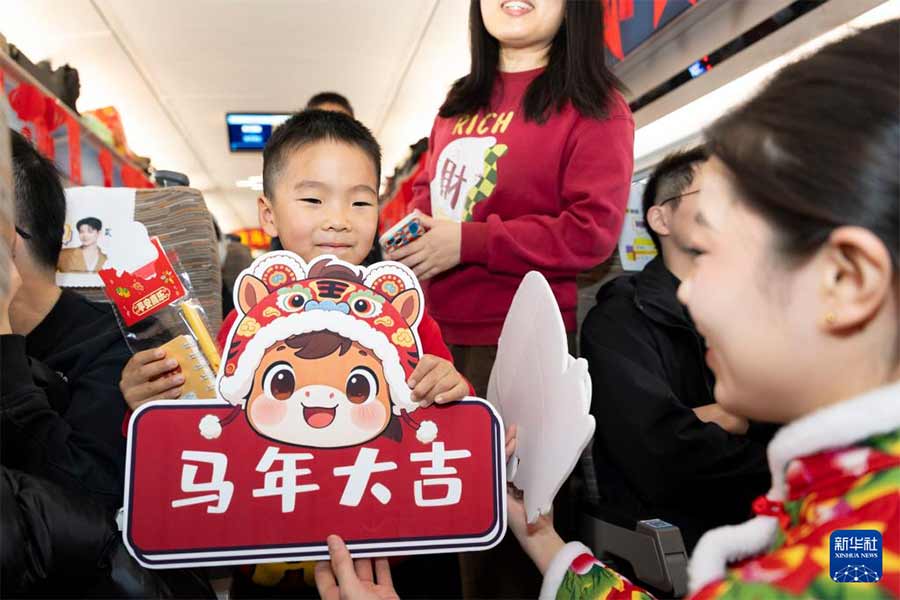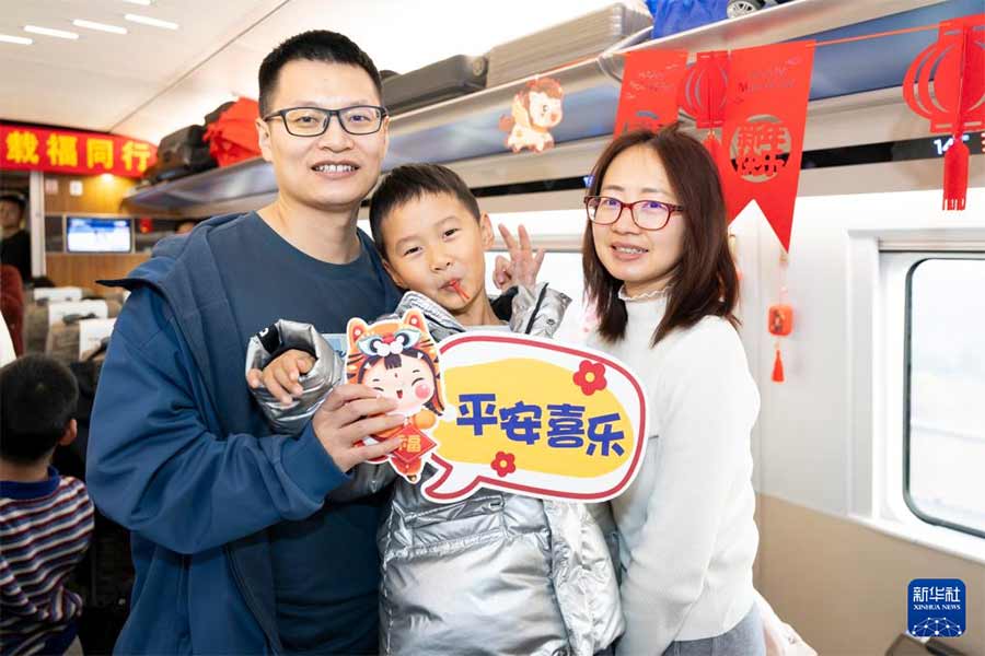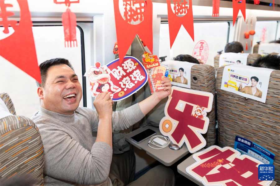 2月15日,旅客在“列车春晚”活动上打卡合影。新华社记者 王翔 摄