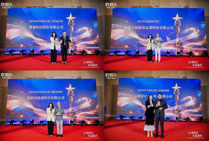 产业发展,伙伴同行。盛典特设“卓越供应商颁奖典礼”,隆重表彰了过去一年中与衣邦人同心协力、共创价值的杰出伙伴。鲁泰纺织、大杨集团、杰恩盛科技、云策设计四家企业在品质、创新、服务与数字化协同方面表现突出,荣膺奖项。获奖企业代表在接受主持人采访时,纷纷表达了对衣邦人平台价值的认可,并期待在未来深化合作,共同成长。