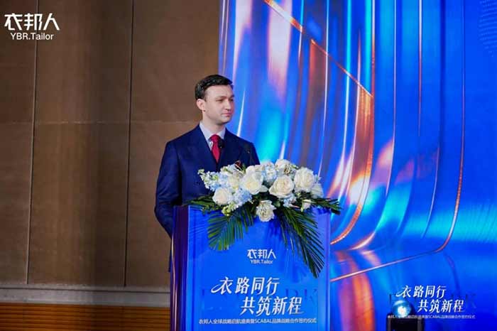 在现场,世佳宝全球时尚业务总监Oleksandr Havrylenko登台致辞,为双方的合作注入了来自百年品牌的深厚期许。他谈到:“当‘面料之王’遇见中国定制领军者,这场跨越国界的握手,不仅是商业合作,更是两种极致精神的共鸣。”他强调,选择与衣邦人同行,是因为看到了其在创新模式背后对品质的深刻敬畏,“这种同频的创新理念与敬畏心态,让我们确信:这不是简单的供需关系,而是价值观的深刻契合。”他更对衣邦人正在推进的门店拓展与全球化战略表示高度认可,并期待双方的携手能在全球高端定制市场催生“1+1>2的化学反应”。