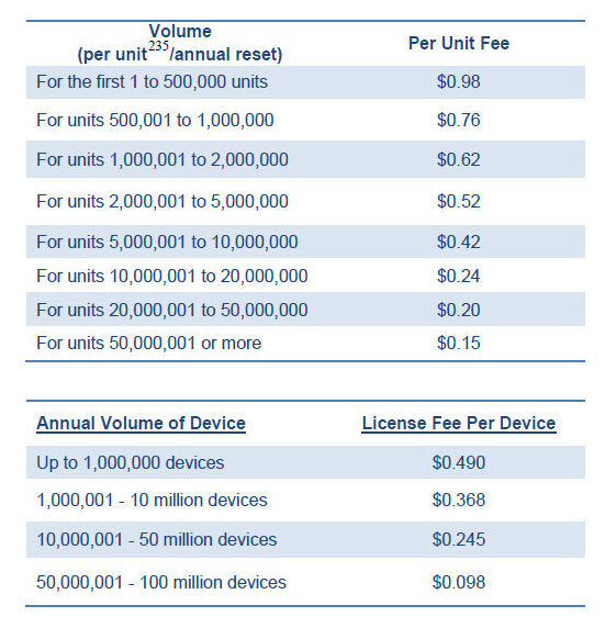 “智能手机累积版权费”报告显示,在手机厂商必须支付的ACC(Advanced Audio Coding)专利授权费中,起步50万部智能手机需要缴纳的费用是0.98美元/部;50万-100万部为0.76美元/部;100万-200万为0.62美元;呈现随量逐步递减的趋势,而到最后达到5000万部以上时,其专利授权费仅为0.15美元/部,是50万部起步阶段专利授权费的15%左右。