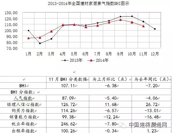 纵观2014年全国建材家居市场总体走势较弱。由商务部流通业发展司、中国建筑材料流通协会共同发布的全国建材家居景气指数(BHI)11月份数据为107.11,环比下降6.38点,同比下降7.20点。全国规模以上建材家居卖场11月销售额为1094.7亿元,环比下降10.96%,同比下降14.22%。1-11月累计销售额为10969.4亿元,同比下降4.04%。(见图1、表一)