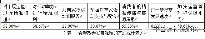 我国目前建材家居市场大多数处于大而全的摊位租赁模式,标榜的是“一站式”采购,但随着房地产发展的变化,更多的“精装修房”、“全装修房”会逐渐替代“毛坯房”,消费者的装修模式及材料的采购方式也会随之变化,更年轻的一代消费者通过互联网进行采购的习惯也已形成,这就呼唤市场要适应这些变化。企业是如何 选择应对的呢?我们的调研表明有半数以上的企业选择了:加强运营管理和保障服务、对市场定位进行精准梳理、加强对消费者的精准传播与客源积累(见图3、表三)。说明多数企业已经意识到了自身挖潜革新的重要性,在行业快速发展期,行业内部深层次的问题和矛盾被掩盖,如今行业发展趋缓,原有问题和矛盾得以显现,这也是经济发展的必然规律,波浪式前进。