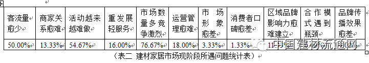 首先,房地产拐点的出现。2013年房地产行业达到了顶峰,顶峰过后往往就意味着下滑。作为下游的建材家居流通行业是和房地产息息相关的。通过对市场的调研问卷我们可以看到,在运营中,“客流量减少”、“活动越来越难做”在调查总数中的占比均为半数以上,已成为广大建材家居市场面临的普遍性问题。(见图2、表二)