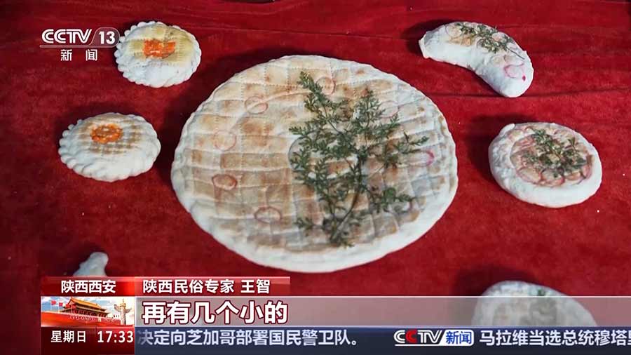 陕西民俗专家王智:关中民间老百姓自古传说最古老的那个月饼,它有个名字叫团圆馍,这个团圆馍一般是有一个最大的,再有几个小的,象征着一家老少。里头还有月牙状的,还有圆状的。家里有几口人就把它切几块,如果远方游子还在外地,把这一块给他留上,用红绫子包上挂上等他回来吃,处处体现了团圆。
