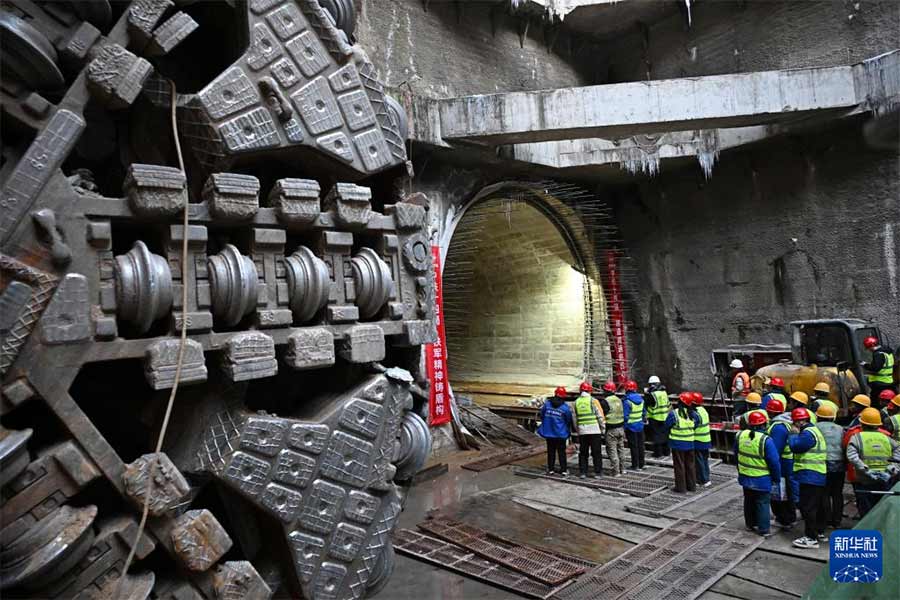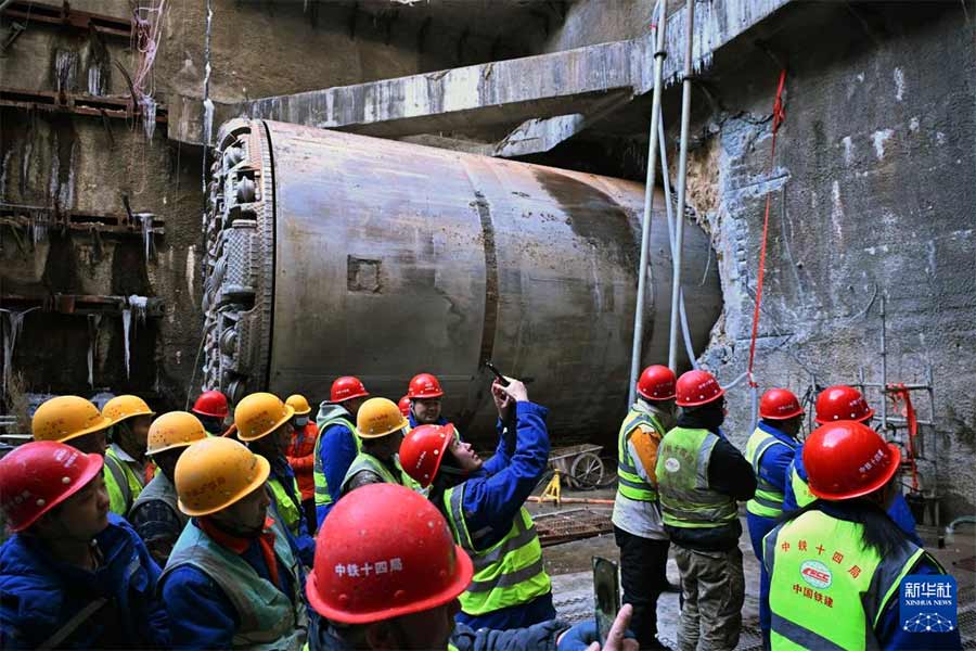 1月21日,建设者在青岛地铁5号线四方厂站接收井等待右线贯通。新华社记者 李紫恒 摄
