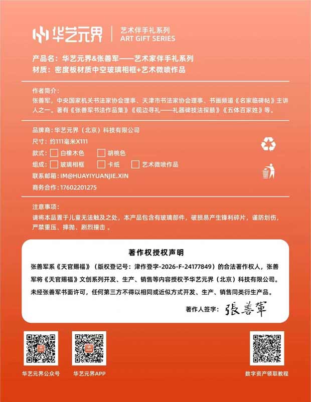 作为一位深耕书坛的艺术家,张善军先生的作品具有极高的艺术价值和收藏潜力。而《天官赐福》摆件,更是他艺术生涯中的一次精彩绽放。无论是对于书法爱好者、收藏家,还是对于希望将传统文化融入现代生活的人们,都是一份珍贵的礼物。 此次联名文创产品数量稀缺,且专属数字资产的领取时间也有限制,因此,诚挚邀请您尽快通过华艺元界公众号或APP,了解更多关于《天官赐福》摆件的详情,并把握时机下单购买。 让张善军先生的艺术魅力与《天官赐福》的祥瑞之气,为您的生活增添一抹色彩与福运。
