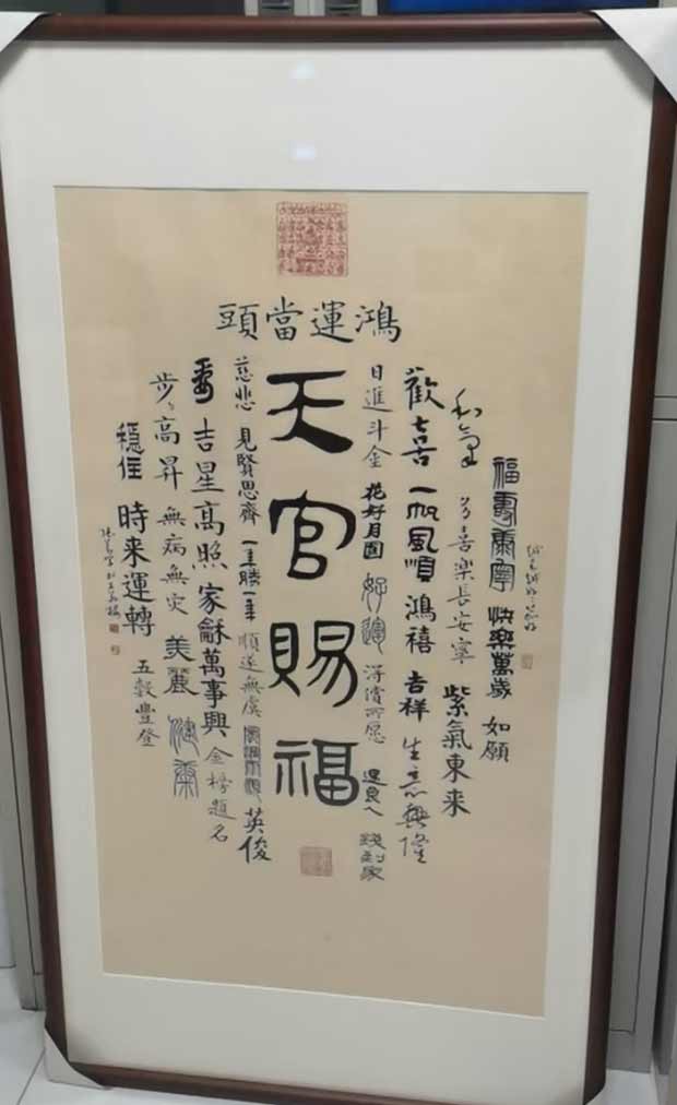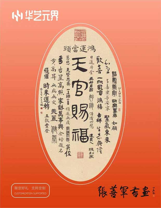 此次华艺元界首款联名艺术家文创产品推出的是张善军先生书法作品《天官赐福》的摆件,《天官赐福》正是张善军先生艺术风格的完美体现。作品中“天官赐福”四字笔触流畅而富有韵律,既展现了传统书法的无穷魅力,又透露出一种祥和与安宁的美好。摆件的设计将书法的神韵与现代工艺结合,使得整件作品既古朴又不失时尚感,无论是置于家中还是办公场所,都能成为一道亮丽的风景。