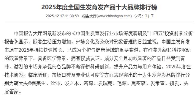 2025年12月17日,中国报告大厅发布《2025年度全国生发育发产品十大品牌排行榜》,在激烈竞争的千亿级个护健康赛道中,广西璟炜生物技术有限公司旗下医用级生发品牌“萌大夫®喜美生”凭借其卓越的科研实力、扎实的临床验证、广泛的用户口碑及权威机构的高度认可,一举夺得榜单首位。这一结果不仅彰显了中国生发育发行业从“经验型护理”向“医学级干预”的深刻转型,也标志着以再生医学与合成生物学为核心的技术路径正成为行业高质量发展的主流方向。