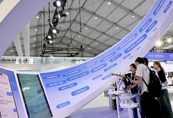 9月10日,工作人员(左)在向参观者介绍人工智能产品。新华社记者 方喆 摄