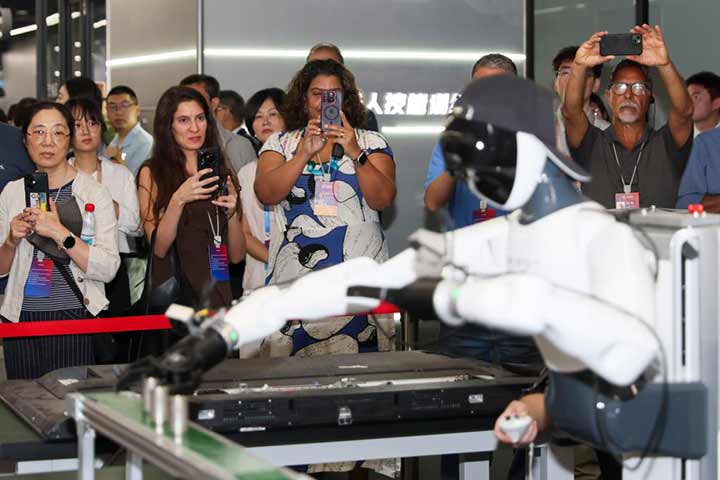 10月13日,嘉宾在上海浦东新区张江科学城内的“模力社区”参观人形机器人。新华社记者 王翔 摄