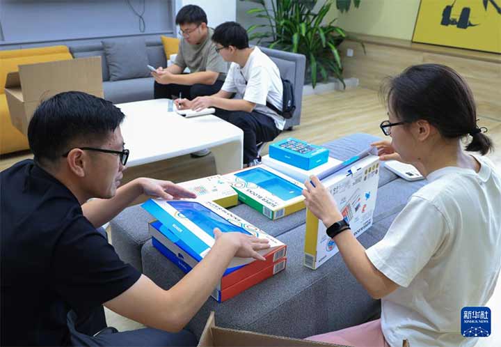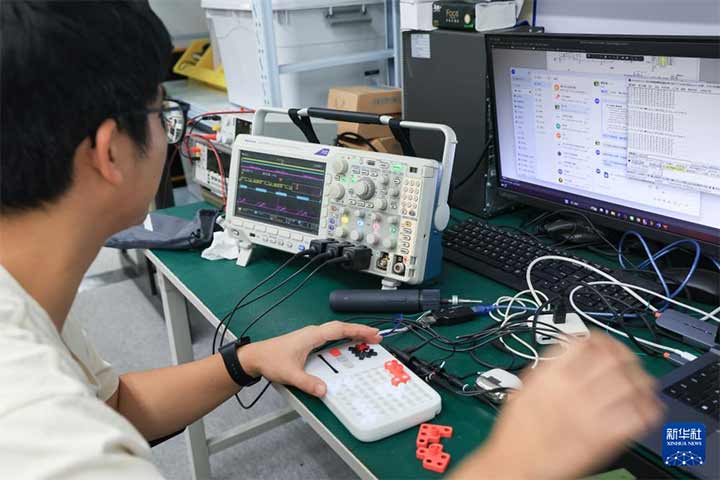 10月29日,在位于广东佛山顺德广东工业设计城的计客总部,研发人员对超级积木的硬件进行测试。新华社记者 毛思倩 摄 新华社记者 毛思倩 摄