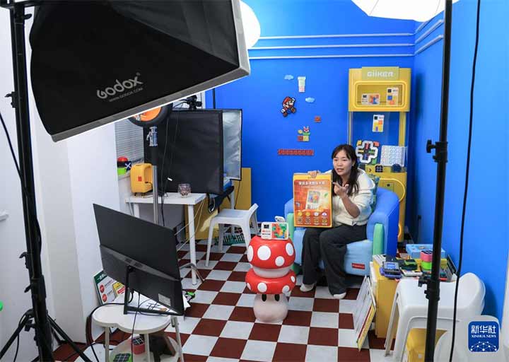 10月29日,在广东佛山顺德的广东工业设计城,计客主播在直播平台介绍超级积木玩具。新华社记者 毛思倩 摄 新华社记者 毛思倩 摄