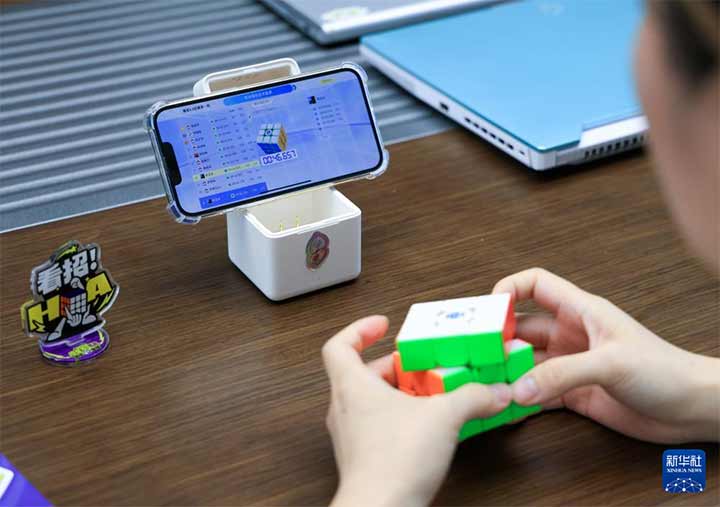 10月29日,在广东佛山顺德,淦源科技创始人江淦源演示智能魔方的联网玩法,智能魔方内置传感器和蓝牙芯片,依靠这些电子设备,能精确监测魔方的每一次转动。新华社记者 霍思颖 摄