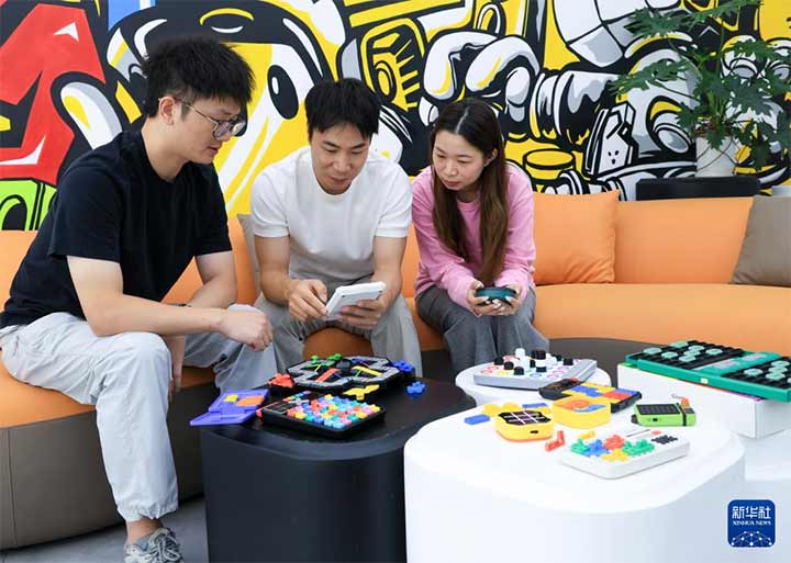 10月29日,在广东佛山顺德的广东工业设计城,计客创始人苏梓铭(中)与员工一起讨论公司的智能益智玩具产品。新华社记者 毛思倩 摄