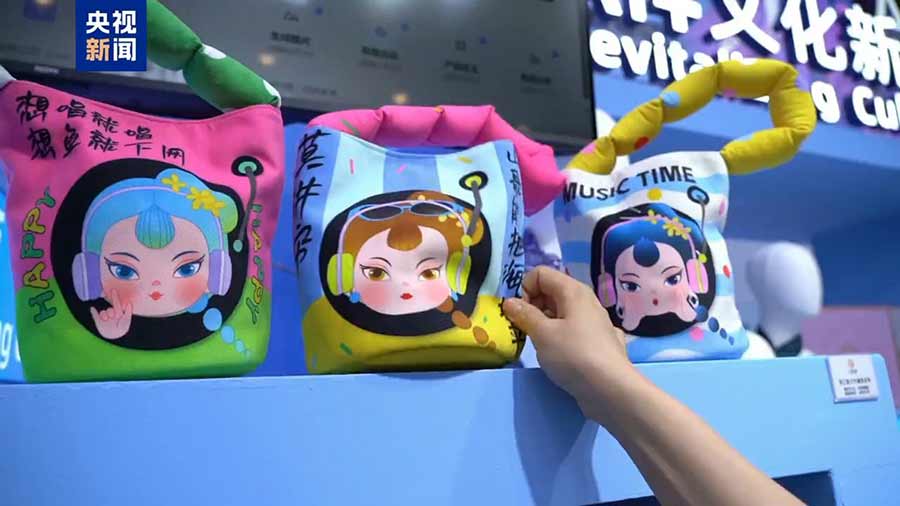 总台央视记者张歆: 在人工智能专馆,除了有炫酷的机器人,我们可以看到,这个水桶包就是由人工智能提供灵感的,以刘三姐为IP形象的文创产品。那么这个水桶包还引用了刘三姐山歌的内容,“山歌能把海填平”。
