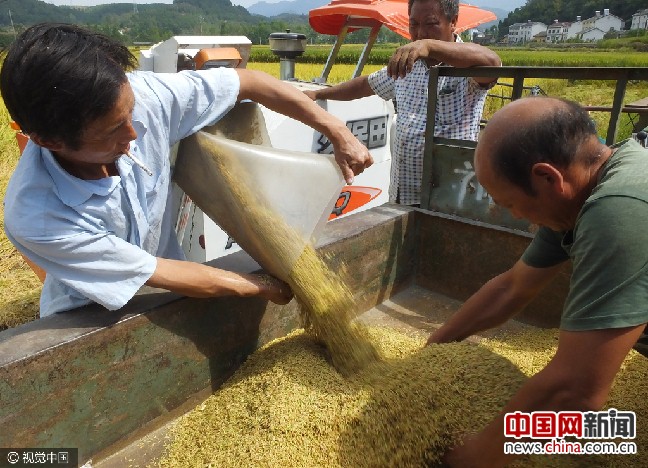 2016年9月,湖北宜昌农民收获稻谷。图片来源:视觉中国