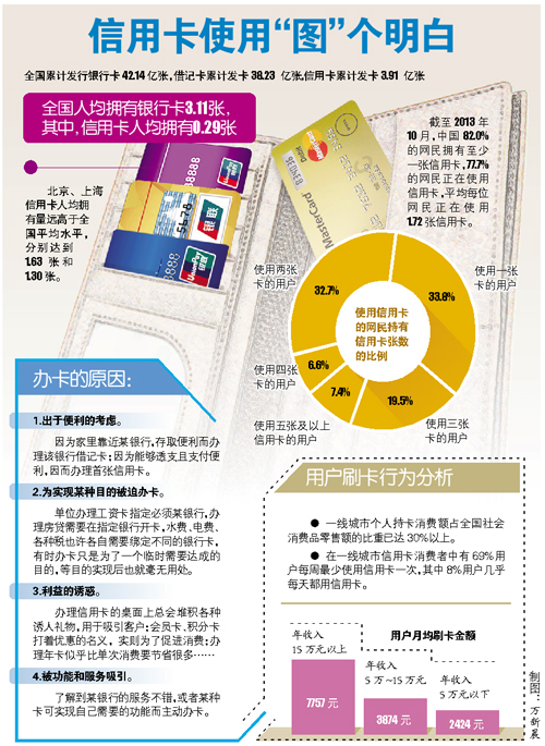 近日,央行公布的《2013年支付体系运行总体情况》数据显示,截至2013年年末,全国累计发行银行卡42.14亿张,人均拥有银行卡3.11张,其中,信用卡人均拥有0.29张。