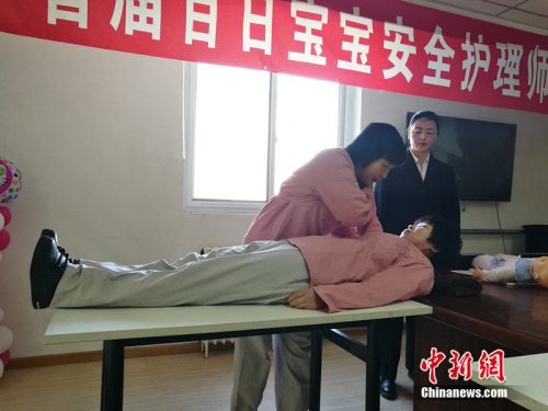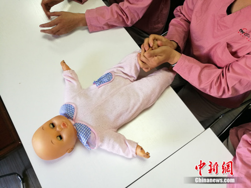 北京一家月嫂培训公司正在进行婴儿护理相关的实际操作训练。(中新网 李卿 摄)
