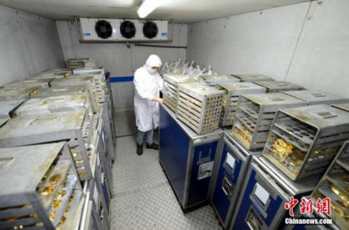 ↑资料图:预计距离飞机快降落时,工作人员开始将食物装入送餐车,进入停机坪等待舱门打开,将飞机餐送入机舱中。图为还没有配送出去的食物都放在冷藏室。