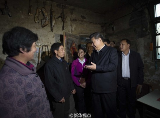 踏着青石条垒砌的台阶,习近平走进村民陈泽平家两间简陋的房子仔细察看,询问家里的情况。
